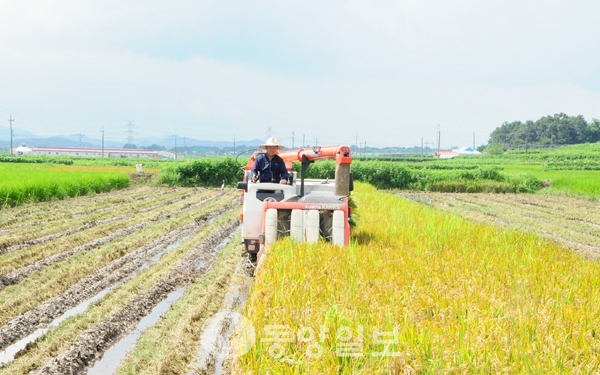 (예산=동양일보 이종선 기자) 예산군은 올해 극심한 봄 가뭄과 집중호우 등 어려운 기상 여건을 이겨내고 17일 고덕면 일원에서 도내 첫 벼 베기가 실시됐다.