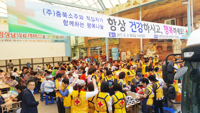 (동양일보 경철수 기자)㈜충북소주와 대한적십자사 충북지사, 증평군 적십자 봉사회원은 31일 오전 11시부터 증평읍 장뜰마당에서 ‘사랑의 점심나누기’를 개최했다.