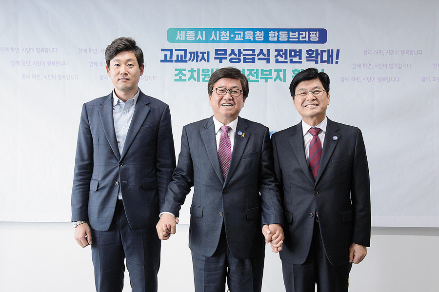 최교진 세종시교육감과 이춘희 세종시장, 고준일 세종시의장은 7일 세종시교육청에서 고교 저면 무상급식 시행을 위한 합의문을 발표했다. 시와 교육청이 인식을 같이해 내년부터 고교까지 전면 무상급식이 확대 시행된다.