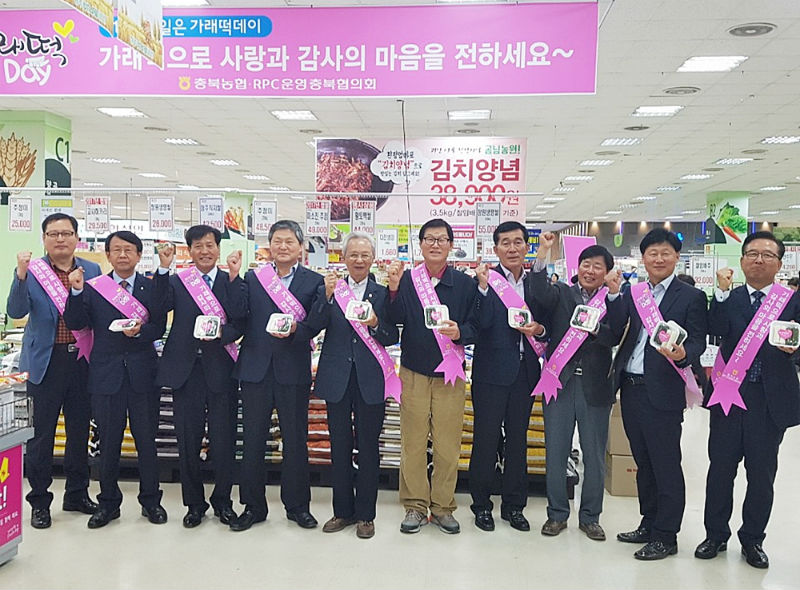 충북농협과 RPC운영 충북협의회(회장 유인재 오송농협 조합장)은 9일 청주시 방서동 농협하나로클럽에서 ‘11월 11일은 가래떡으로 감사와 사랑을 전하세요’라는 슬로건을 걸고 시민들을 대상으로 가래떡 나눔행사를 실시했다.