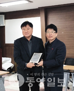 (아산=동양일보 서경석 기자) 아산시 영인면이 13일 면사무소 회의실에서 지역발전협의회 정례회의를 개최한 가운데 지역발전에 공이 큰 박영호(왼쪽) 용하산업 사장이 감사패를 수상했다.