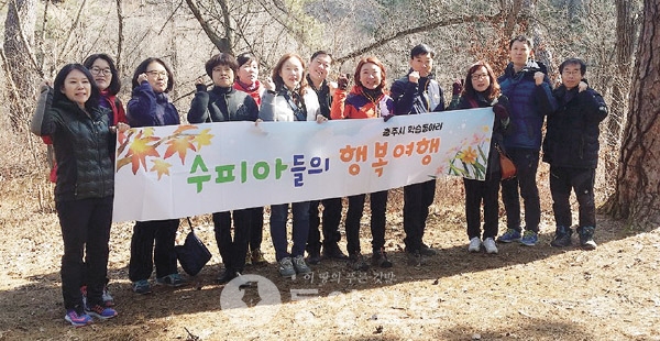 (충주=동양일보 윤규상 기자) “함께 곳곳 누비며 행복 키워요”충주시청 학습동아리 ‘수피아들의 행복여행’은 공무원들과 지역에서 활동 중인 숲 해설가 등 16명이 모여 2015년 발족했다.