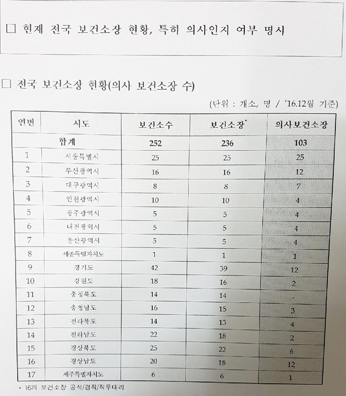 보건복지부에 따르면 2016년 말 현재 의사 출신의 보건소장이 단 1명도 없는 곳은 전국 17개 시·도 중 충북이 유일하다.