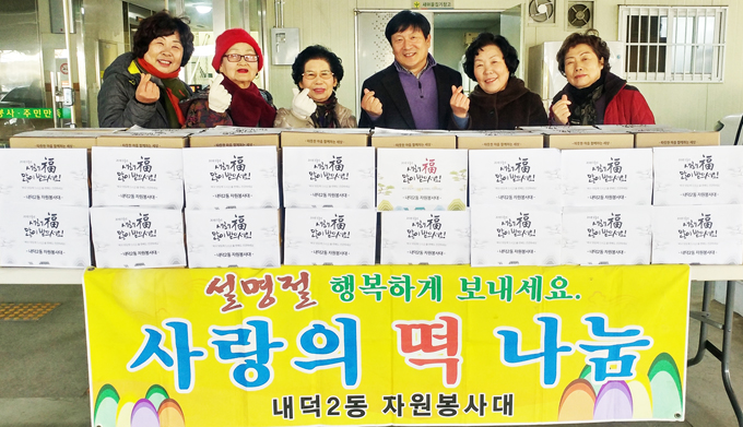 청주시 청원구 내덕2동 자원봉사대는 8일 설 명절을 맞아 40㎏들이 떡국용 떡 100개를 저소득가정에 전달했다.