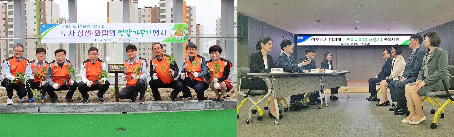 텃밭 가꾸기에 앞서 노사는 협약식을 갖고 상호존중과 신뢰를 바탕으로 ‘일과 삶의 균형을 갖춘 직장 문화 조성’과 ‘농업인과 고객이 행복한 충북농협 건설’이라는 공동의 가치를 구현키로 했다.