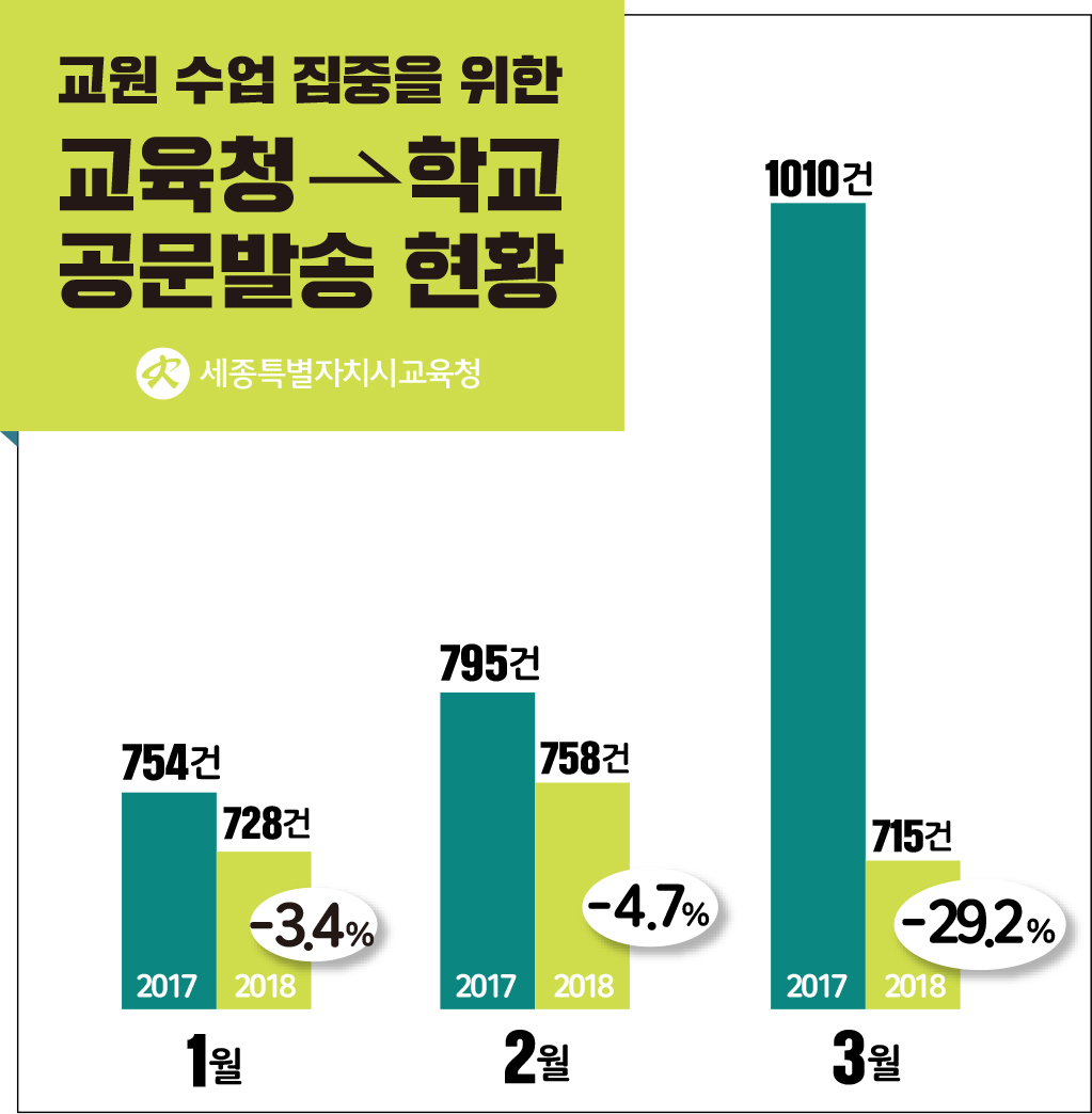 11일 세종시교육청에 따르면 필수공문 외에는 업무관리시스템 공문게시를 이용해 2017년 2559건 대비(1∼3월말 기준) 2201건을 생산해 358건, 14%를 감축했다.