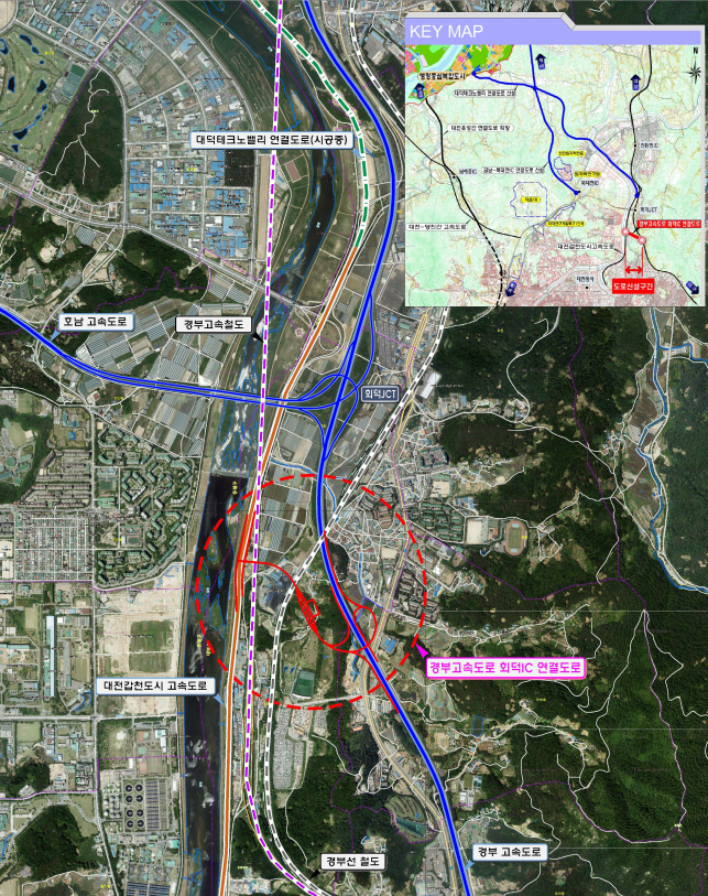 ‘회덕나들목(IC)연결도로’ 사업은 신탄진나들목(IC)의 교통혼잡 완화 및 영남권에서 행복도시로의 최단거리 확보를 위해 총 사업비 721억원을 행복청과 대전시가 매칭으로 각각 50%씩 분담해 총 연장 0.8km(IC신설)를 2023년까지 시행한다.