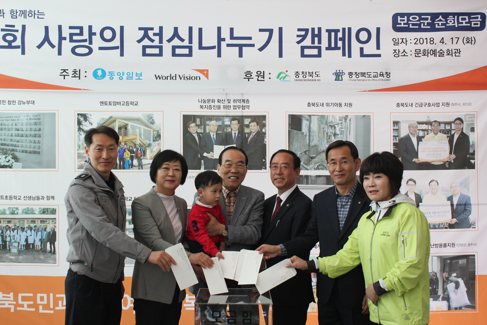 (동양일보 이종억 기자) 동양일보와 월드비전 충북지부가 공동 주관하고 충북도·충북도교육청이 후원하는 23회 사랑의 점심나누기 캠페인 보은군 순회 모금행사가 17일 보은 문화예술회관에서 열렸다.
