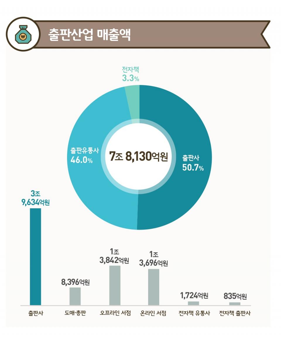 이 자료에 따르면 2016년 국내 출판산업 전체 매출액은 7조8130억원이다. 전년 대비 2.0% 증가한 액수다.