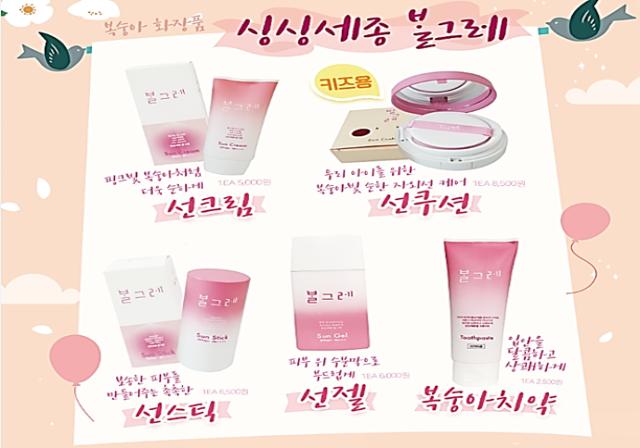 세종시 복숭아로 만든 선크림, 선스틱, 선젤, 선쿠션 등 자외선 차단제품 4종과 복숭아 치약을 선보인다.
