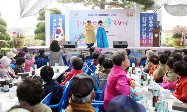 (동양일보 장인철 기자) 3선 당선이 확실한 지지기반에도 젊은 후배들을 위해 길을 터 주겠다며 불출마를 선언한 우종재 서산시의회 의장이 3일 부석면 경로행사에 부인과 함께 한복차림으로 나와 감사인사를 하고 있다.