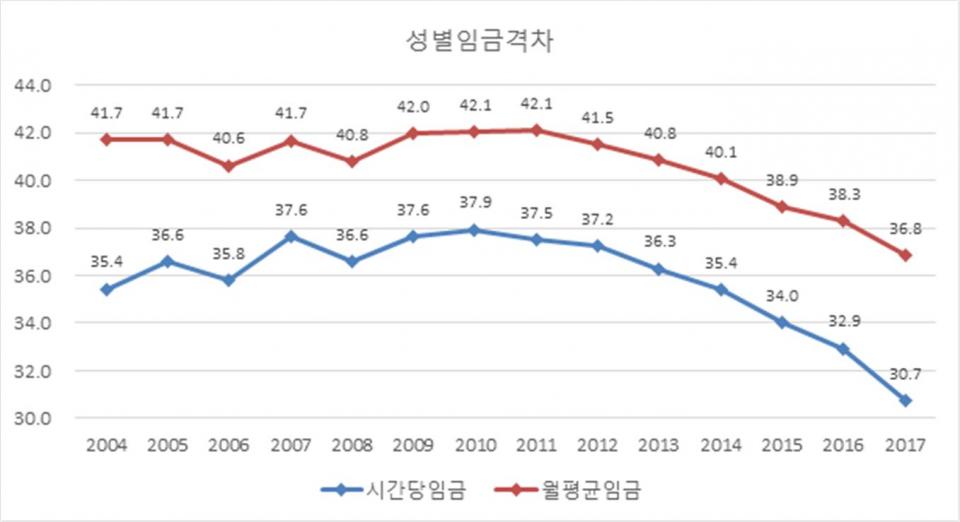 자료에 따르면 남녀 시간당 임금격차는 2010년 37.9%로 정점을 찍은 뒤 빠르게 줄어드는 추세다. 2017년에는 30.7%로 역대 최저치를 기록했지만 그래도 여전히 경제협력개발기구(OECD) 국가 가운데 최고 수준이다.