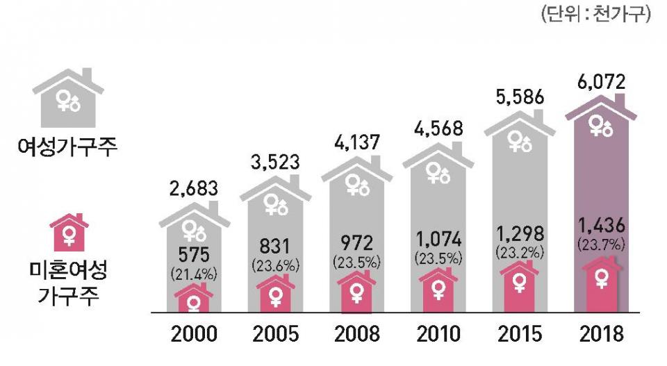 2일 여성가족부와 통계청이 발표한 '2018 통계로 보는 여성의 삶'에 따르면 올해 여성 가구주는 전체 30.7%인 607만2000가구로 조사됐다. 여성 가구주가 600만 가구를 넘어선 것은 최초로, 여성 가구주 비율은 2000년에 비해 12.2%포인트 올랐다.