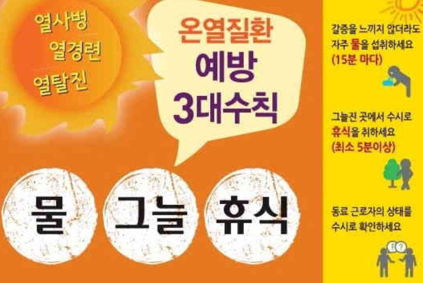 폭염 시에는 갈증을 느끼기 이전부터 규칙적으로 수분을 섭취해야 하고 어지러움과 두통, 메스꺼움 등 온열질환 초기증상이 나타나면 즉시 작업을 중단하고 시원한 곳으로 이동해 휴식을 취해야 한다.