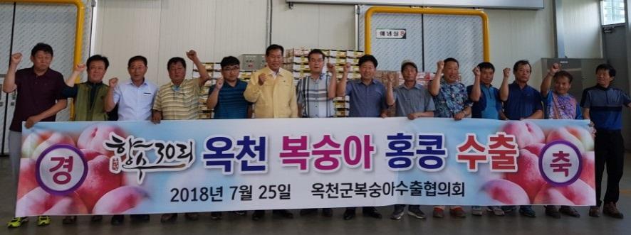 옥천 복숭아수출협의회(대표 송찬두)는 25일 옥천군농산물산지유통센터에서 협의회 회원 등 20여명이 참석한 가운데 수출 기념식을 갖고 수출업체를 통해 그레이트와 천중도 복숭아 400㎏을 우선 실어 보냈다.