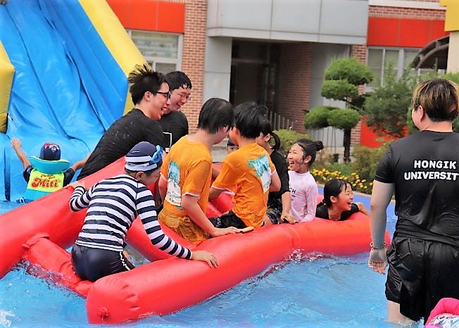 이번 캠프에서 홍익대 교육봉사단원 16명은 ‘행복쉼터 만들기 프로젝트’를 기반으로 △벽화 색칠하기 △나노 블럭 만들기 △팔찌 만들기 △보드게임 △미니 운동회 △신나는 물놀이 △시원한 물총놀이 등으로 가르치는 기쁨과 배우는 즐거움으로 행복을 느끼는 시간을 가졌다.