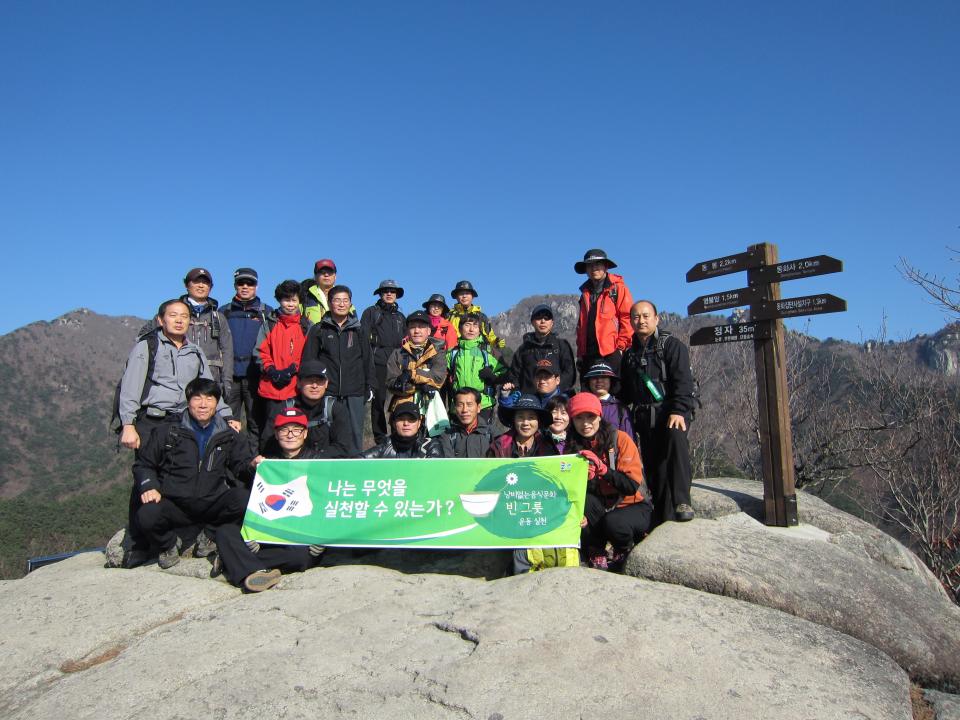 산 입구부터 ‘빈 그릇 실천운동 CD'를 나눠주고 등산 중에도 주변을 두리번거리며 빈병과 쓰레기를 주워 담는 사람은 틀림없이 태안군청 산악회 회원들이다. 정상에서 ‘꽃과 바다의 도시 태안으로 오세요’ 현수막을 들고 활짝 웃고 있는 사람들도 그들이다.