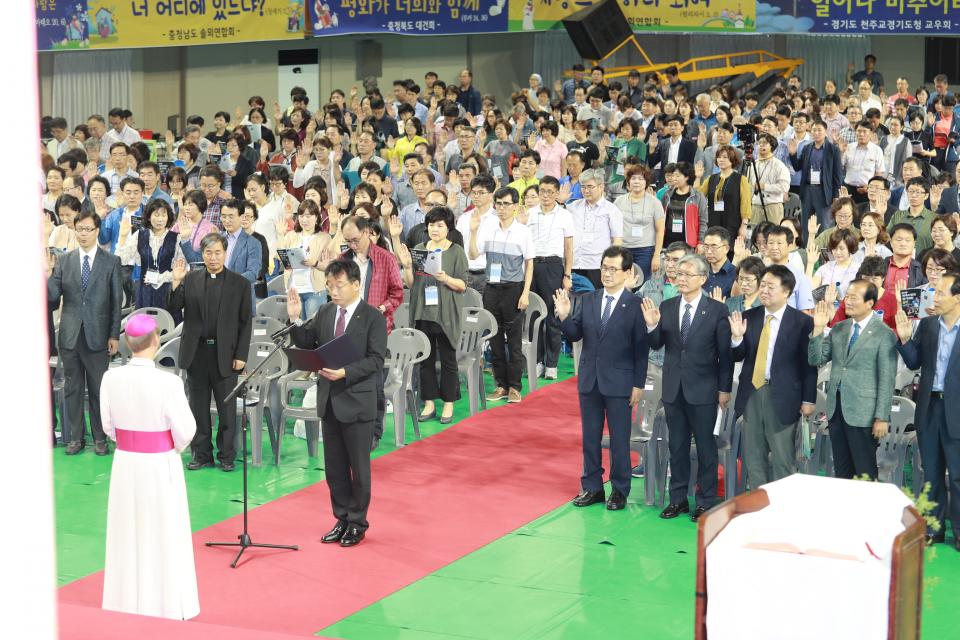 (동양일보 박장미 기자) 천주교청주교구 설정 60주년을 맞아 충북도 가톨릭 공무원으로 구성된 충북대건회가 주관한 '35회 대한민국 가톨릭공직자 피정대회'가 8일 청주체육관에서 열렸다. '평화가 너희와 함께(루가복음 24절 35절)'를 주제로 열린 이날 대회는 성령쇄신봉사회 박효철 베네딕도 신부의 강론과, 문화공연, 신앙체험 등으로 진행됐다. 공직자들은 이날 장봉훈 주교 앞에서 '가톨릭 공직자답게 살겠습니다'라는 선언문을 발표하고, 국민의 봉사자로서 소명을 다할 것을 다짐했다.