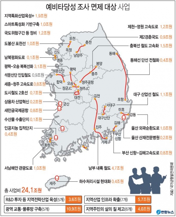 정부가 국가균형발전을 위해 총사업비 24조1000억원 규모의 23개 사업에 대해 예비타당성조사를 면제한다.