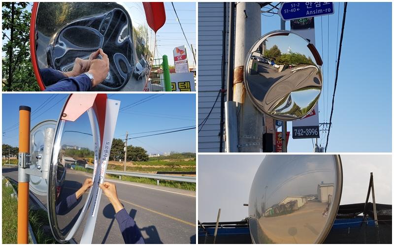 반사경은 곡선도로 혹은 건물 등에 가려 주변의 식별이 어려운 교차로 구간에 설치하는 거울로, 상호 충돌을 막고 보행자를 보호하기 위한 필수 교통안전 시설물이다.