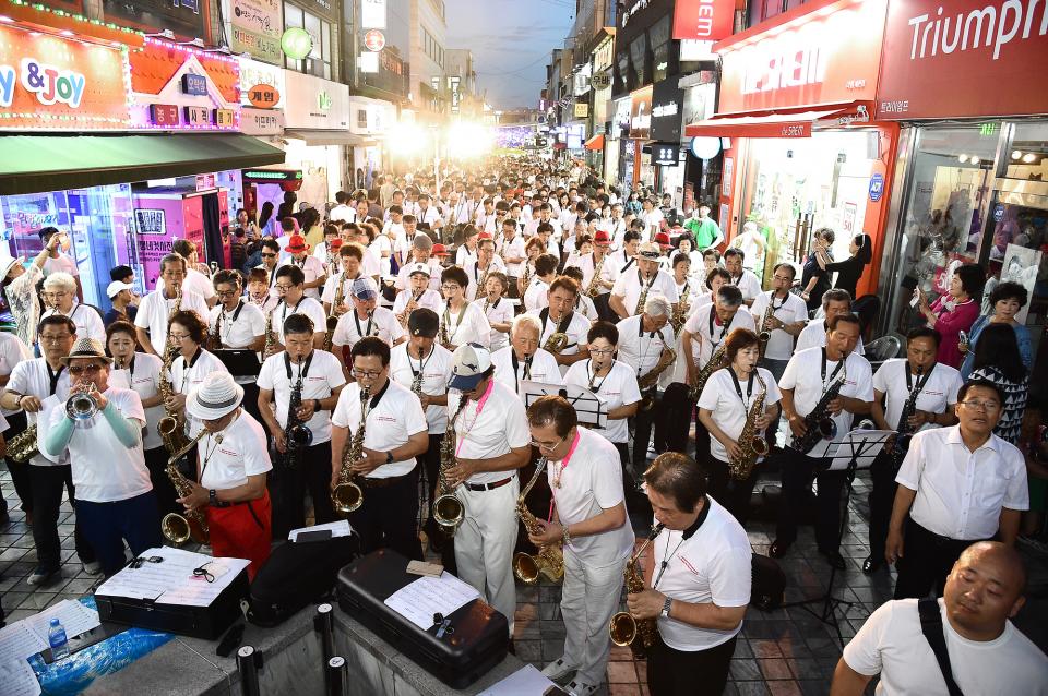 (동양일보 장승주 기자) 15회 제천국제음악영화제의 개막 3일째를 맞은 지난 10일 문화의 거리에서는 전국에서 모인 25개팀의 색소폰 합주경연 대회에 이어 500인의 색소폰 연주자들이 동시에 같은 곡을 색소폰으로 연주하는 장관을 연출하며 기네스 도전에 성공했다.