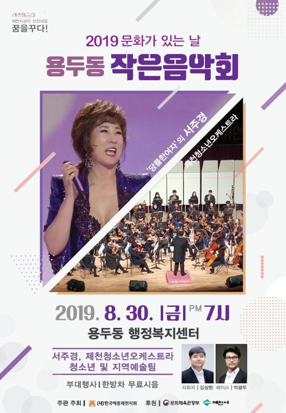 [동양일보 장승주 기자]제천시는 문화체육관광부에서 주관하는 2019 ‘문화가 있는 날’ 지자체 자유기획 프로그램 운영 지원사업(생활 밀착형 문화시설 거점) 공모사업에 선정, 30일 오후 7시 용두동 행정복지센터에서 트로트가수 서주경, 청소년오케스트라 초청공연 등 8월의 작은 음악회를 연다.