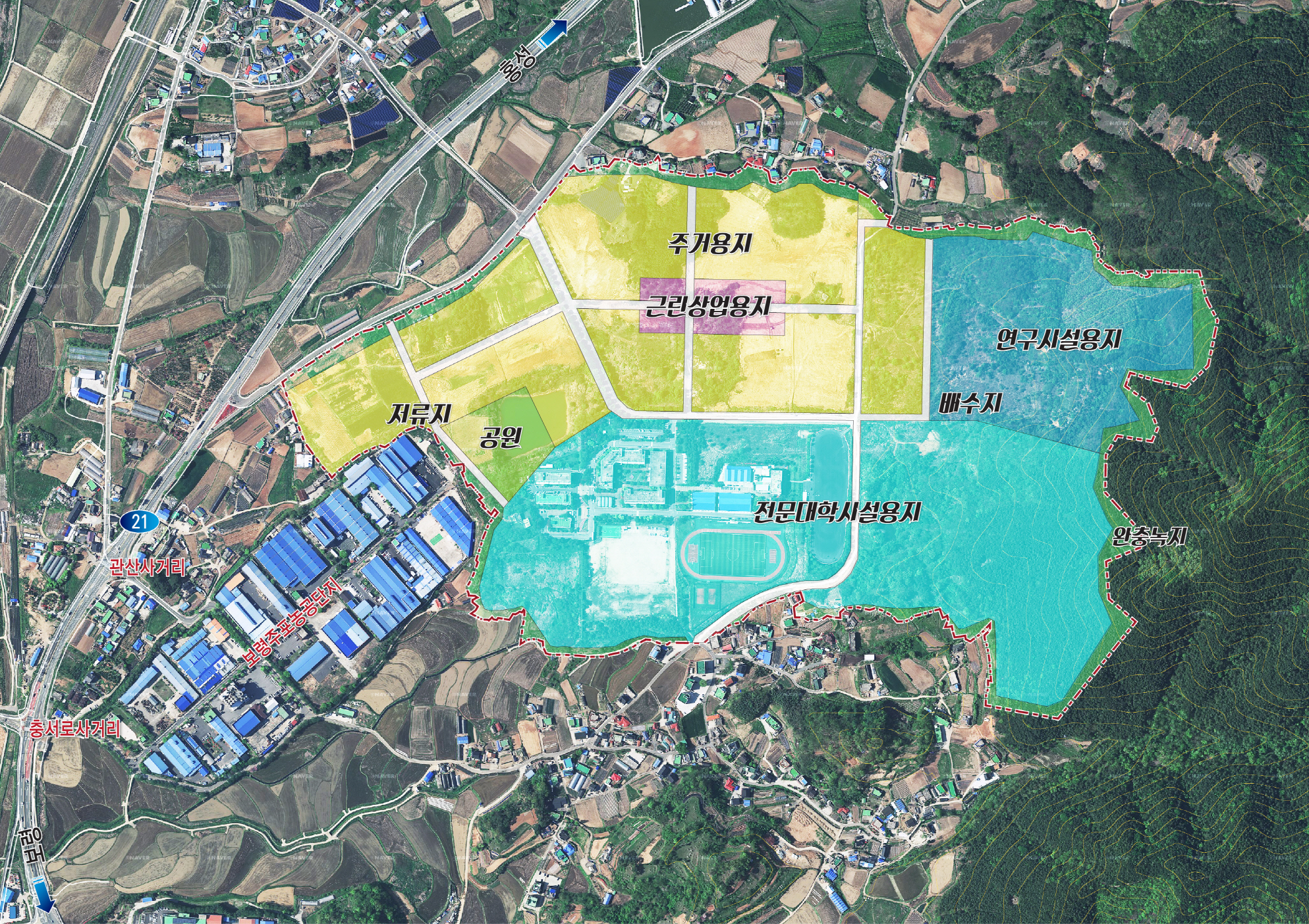 부지확보로는 보령시 주포면 관산리(290-1)일원인 관창산업단지 77만7851㎡ 중 약 9만㎡의 면적에 시업 시행자는 ㈜대우건성 대우학원이며 토지이용계획으로는 주거시설, 근린상업 공공시설 기타 시설이다.