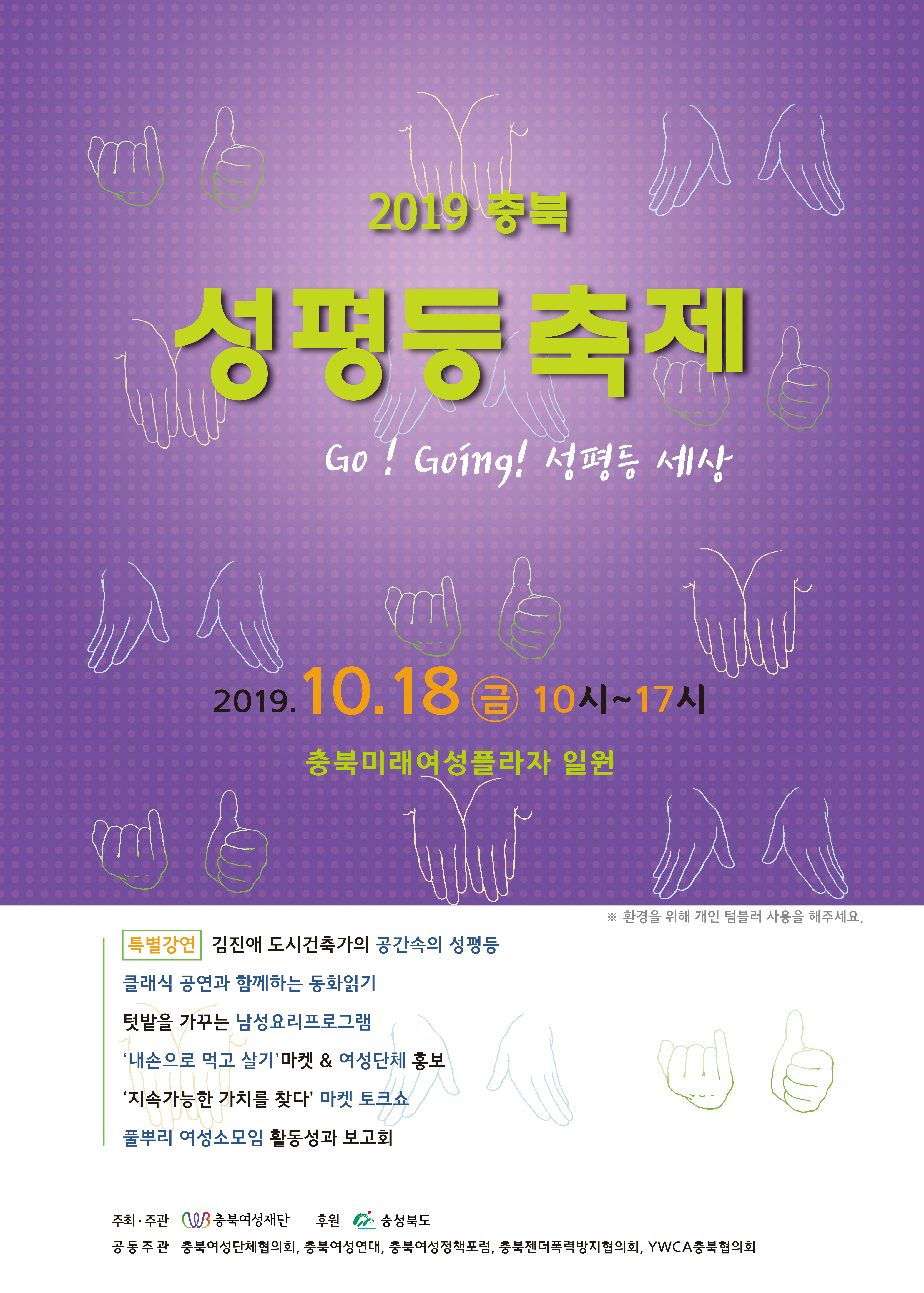 충북여성재단과 도내 여성단체가 공동주관한 이번 축제의 슬로건은 ‘GO! Going 성평등 세상’으로 충북여성단체협의회, 충북여성연대, 충북여성정책포럼, 충북젠더폭력방지협의회, YWCA 충북협의회 등 70여개 기관과 단체가 참여했다.