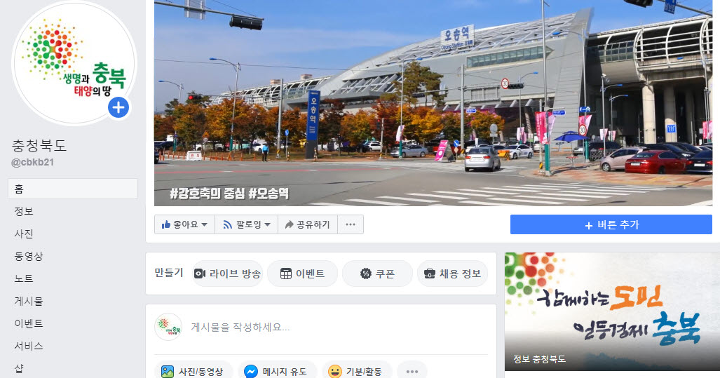 충북도는 도민과의 소통을 위해 블로그, 페이스북, 인스타그램, 카카오스토리, 트위터, 유튜브를 운영하며 도정 콘텐츠를 제공하고 있다. 동영상, 카드뉴스, 라이브방송 등 다양한 형태의 콘텐츠로 도민과 활발히 소통하고 있다.