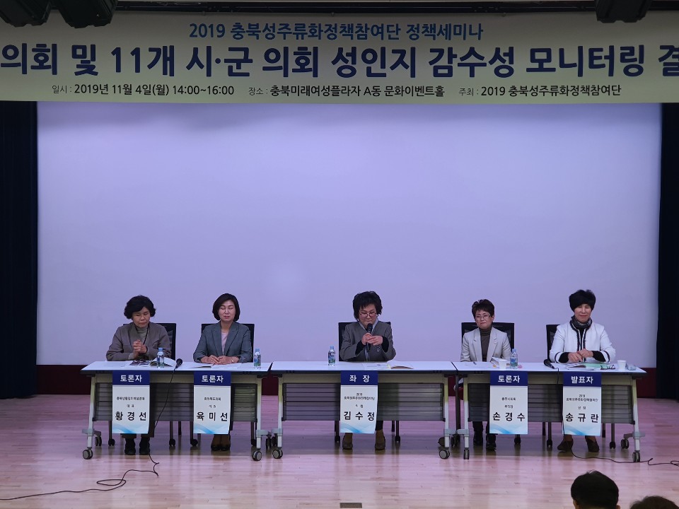 2019충북성주류화정책참여단은 4일 충북미래여성플라자에서 ‘충청북도 의회 및 11개 시·군의회 성인지 감수성 모니터링 결과보고회’를 열었다.