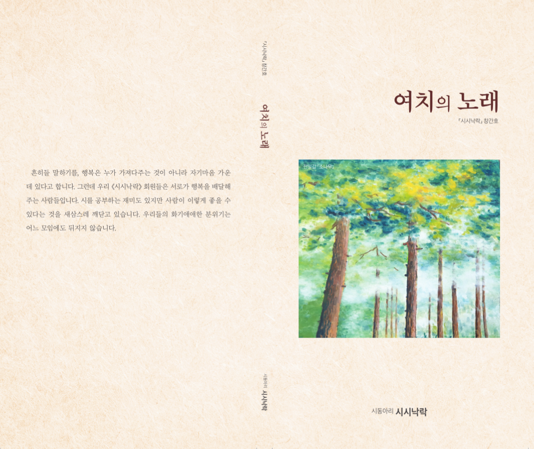 이번에 출판한 ‘여치의 노래’ 시집은 그 동안 시시낙낙(詩詩樂樂)회원들이 쓴 시를 한 권의 책으로 엮어 만든 결과물이다.