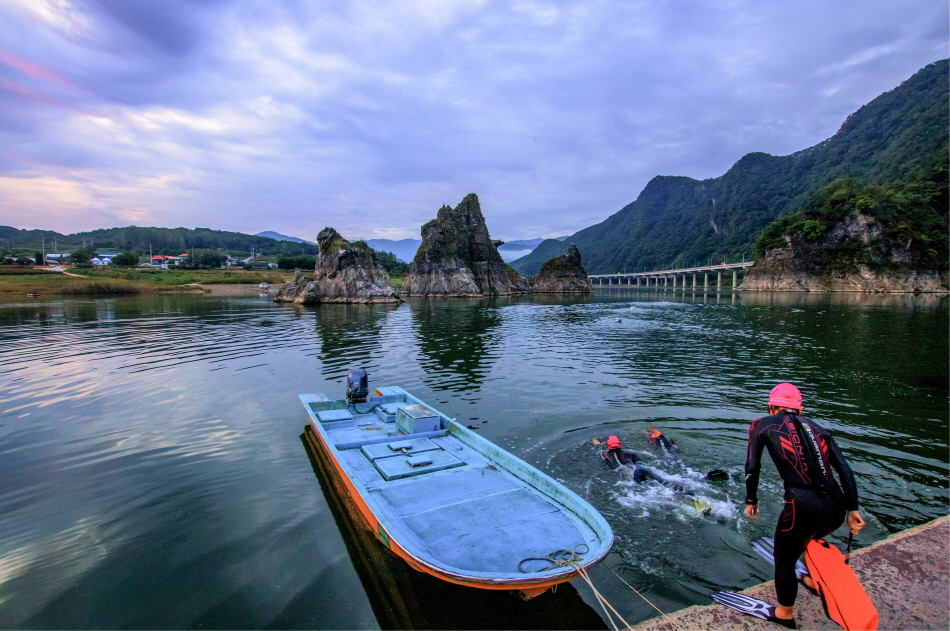 최우수작 방성공(청주) '호반질주' 최우수작 유유신(충남) '수주팔봉의 아침' 최우수작 김남제(청주) '청풍호반 케이블카' 대상작 김범용(대구) '도담삼봉의 물개들' [동양일보 곽근만 기자]사진전 입상작