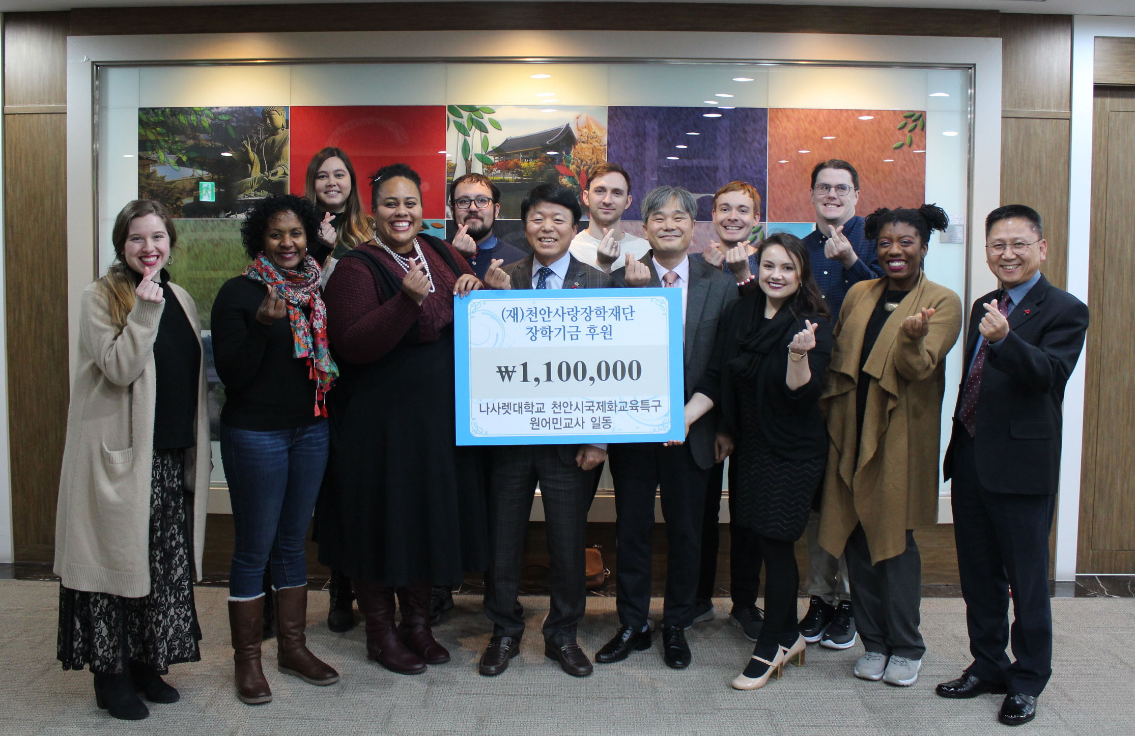 이번 장학금은 나사렛대학교 천안시국제화교육특구사업단 원어민교사 50여명과 한국인 직원들의 자발적인 참여로 모아졌다.
