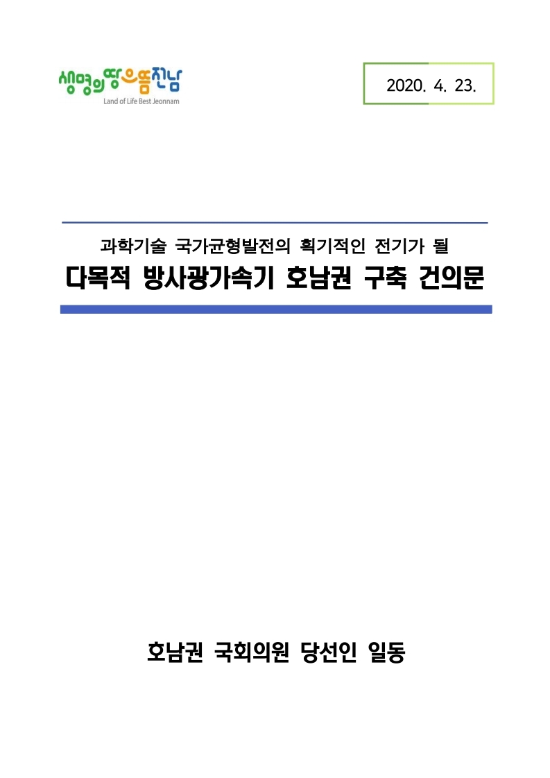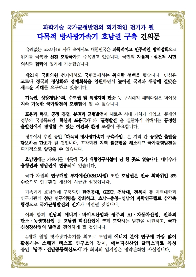 이 건의문은 ‘국가균형발전을 실현할 수 있도록 평가지표를 재조정해 광주·전남 공동혁신도시(나주)에 다목적 방사광가속기를 반드시 구축해야 한다’는 것이 핵심 내용이다.
