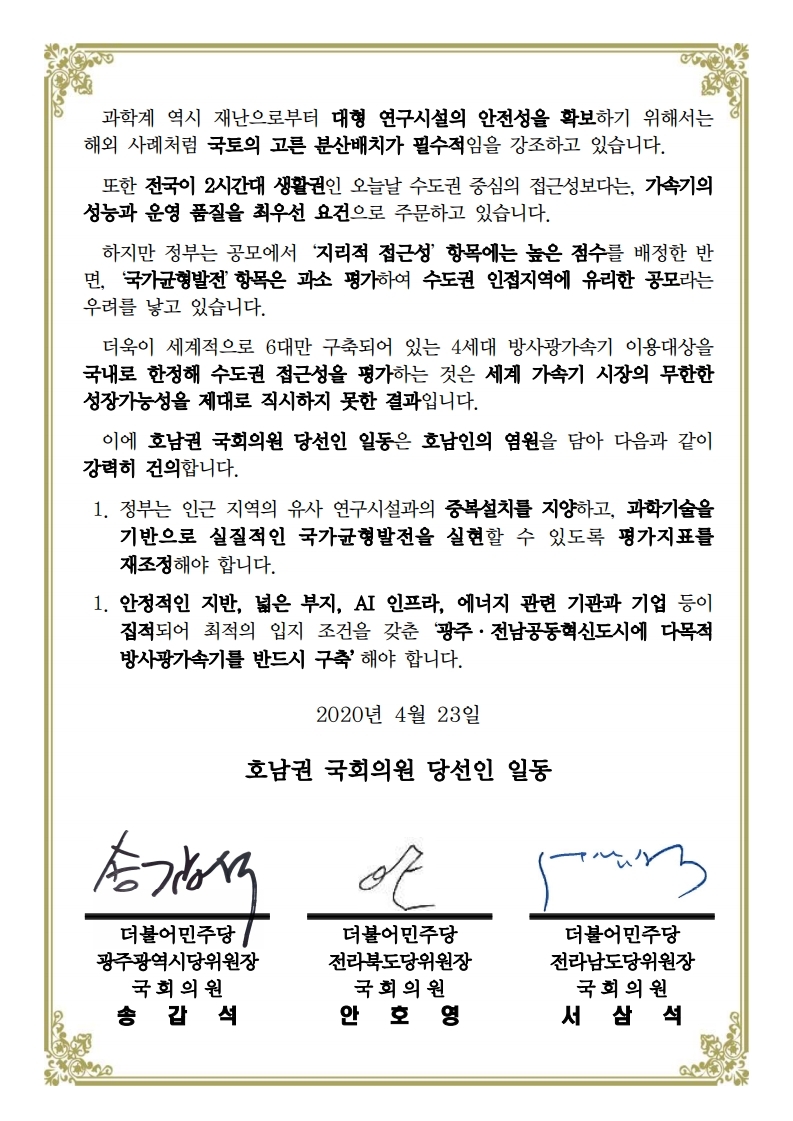 이런 상황에서 호남권 국회의원 당선인 28명은 지난 23일 ‘다목적 방사광가속기 호남권 구축 건의문’을 작성, 청와대·국무총리·국회·더불어민주당·과학기술정보통신부 등 정부·여당에 보냈다.