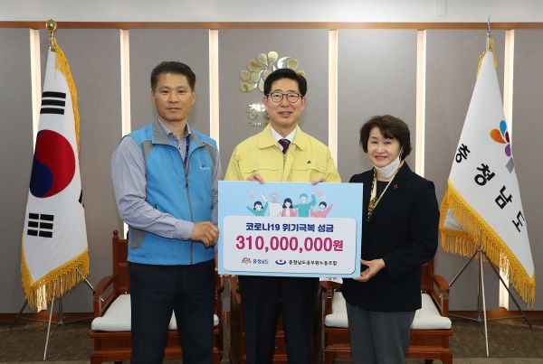 양승조 충남지사와 김태신 도 공무원노동조합 위원장은 27일 도지사 집무실에서 박은희 충남사회복지공동모금회 사무처장에게 코로나19 극복 성금 3억1000만원을 전달했다.