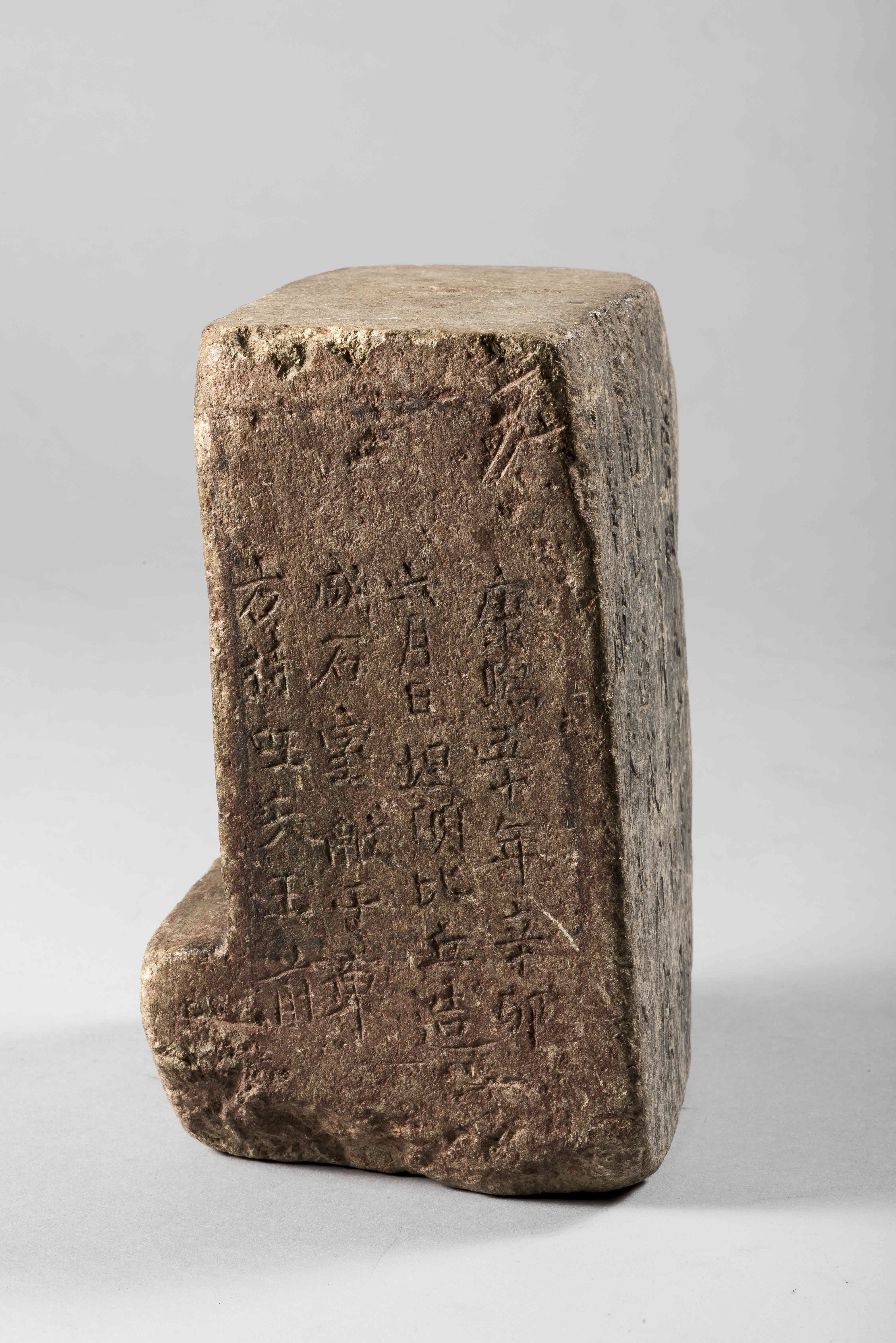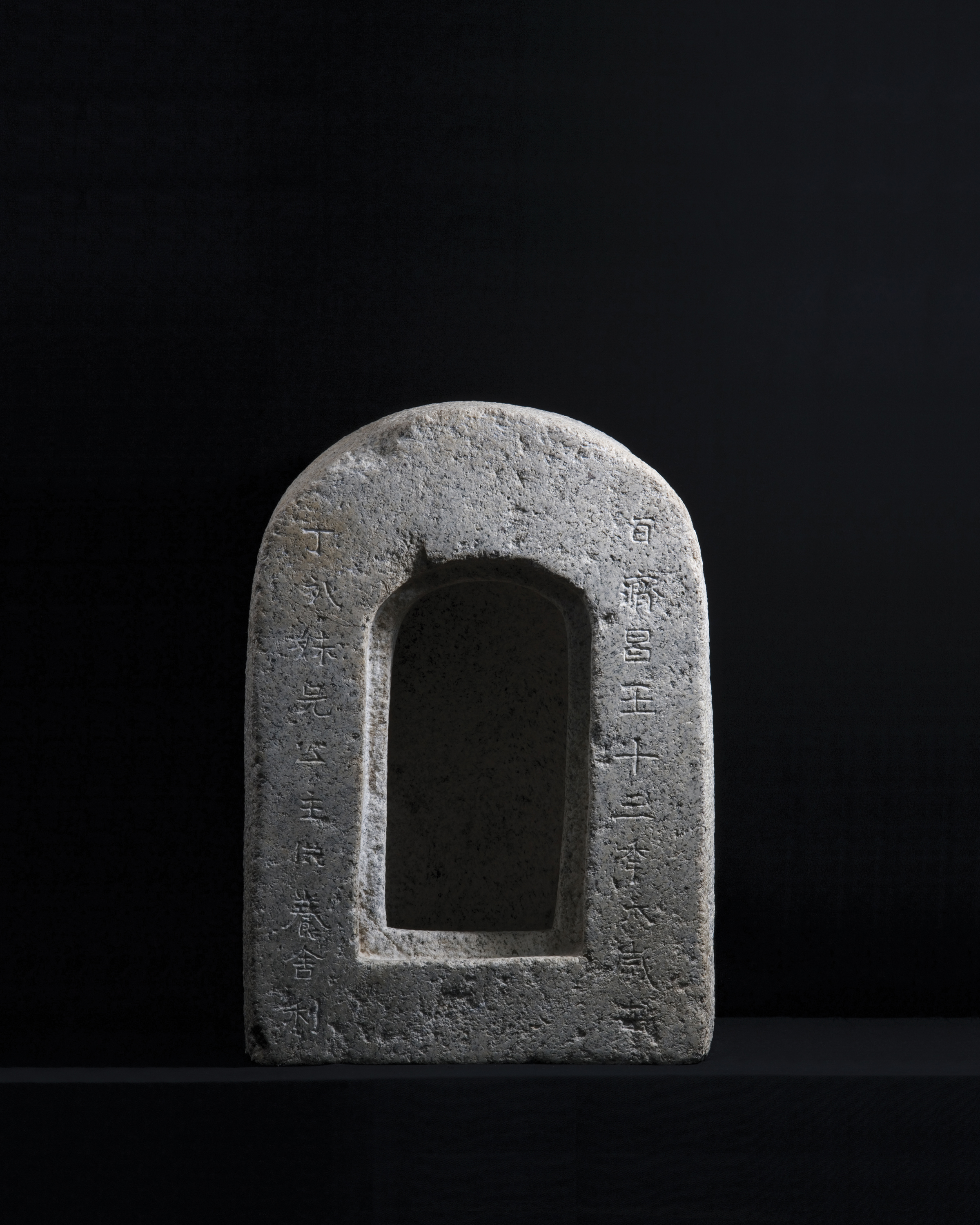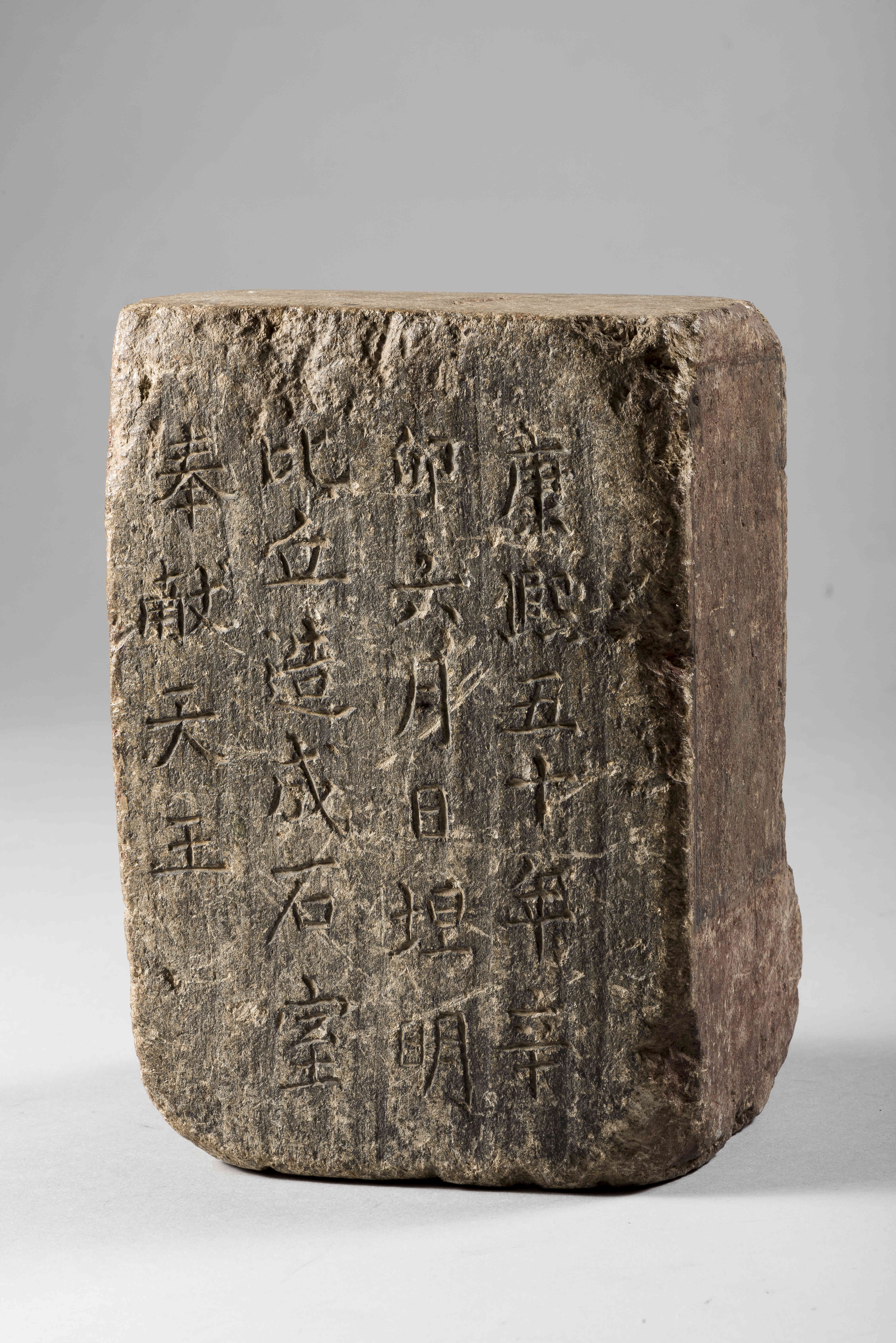 배면에는 해서체의 종서로 康熙五十年 辛卯年 六月 日 坦明比丘 造成石室 奉獻天王 이라는 4행 22자의 명문이 음각되었고, 우측면에도 동일한 명문이 있는데 말미에 東方持國天王前 이라 하여 석감의 봉납대상을 밝히고 있다.