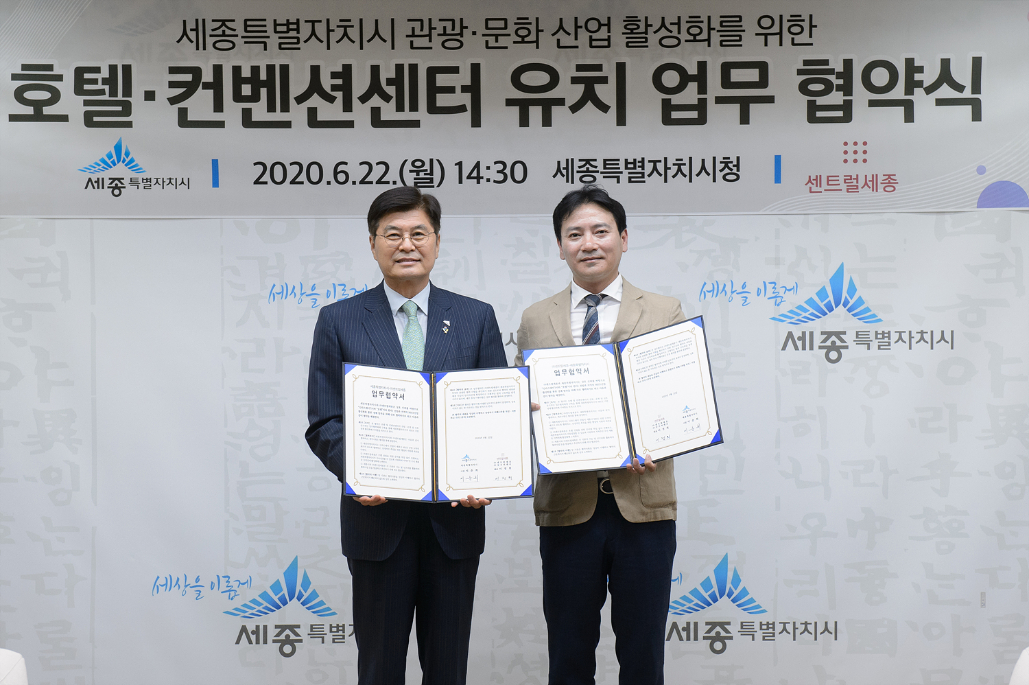시는 22일 시청 접견실에서 이춘희 시장과 ㈜센트럴세종 이정희 대표, ㈜호텔신라 및 교보증권㈜ 관계자 등이 참석한 가운데 ‘세종시 호텔 및 컨벤션 센터 건립을 위한 업무협약’을 체결했다고 밝혔다.