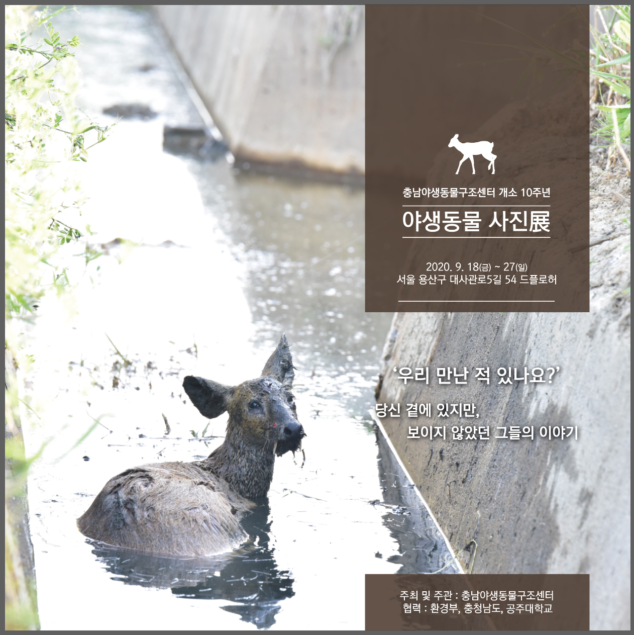 충남야생동물구조센터에 따르면 10년의 과정에서 알게 된 야생동물의 삶과 현실을 대중에게 알려 나의 삶과는 크게 상관없다고 여겼던 야생동물을 나의 실천으로 지켜낼 수 있는 방법을 소개하고자 약 100여점의 사진을 활용한 전시회를 기획했다고 밝혔다.