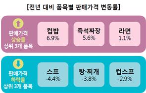 조사대상 품목 중 전년 대비 판매가격 비교가 가능한 11개 품목의 가격 변동률은 6.9%~-4.4%로 나타났다. 컵밥(6.9%)·즉석짜장(5.6%)·라면(1.1%) 등 5개 품목의 가격이 상승했으며, 스프(-4.4%)·탕·찌개(-3.8%)·컵스프(-2.9%) 등 6개 품목은 가격이 하락했다.