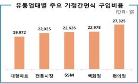 업태별 구입비용 비교결과 대형마트가 편의점보다 26.9% 더 저렴 /// 컵밥·즉석짜장 등 작년보다 가격 상승… 스프 등 6개 품목은 하락