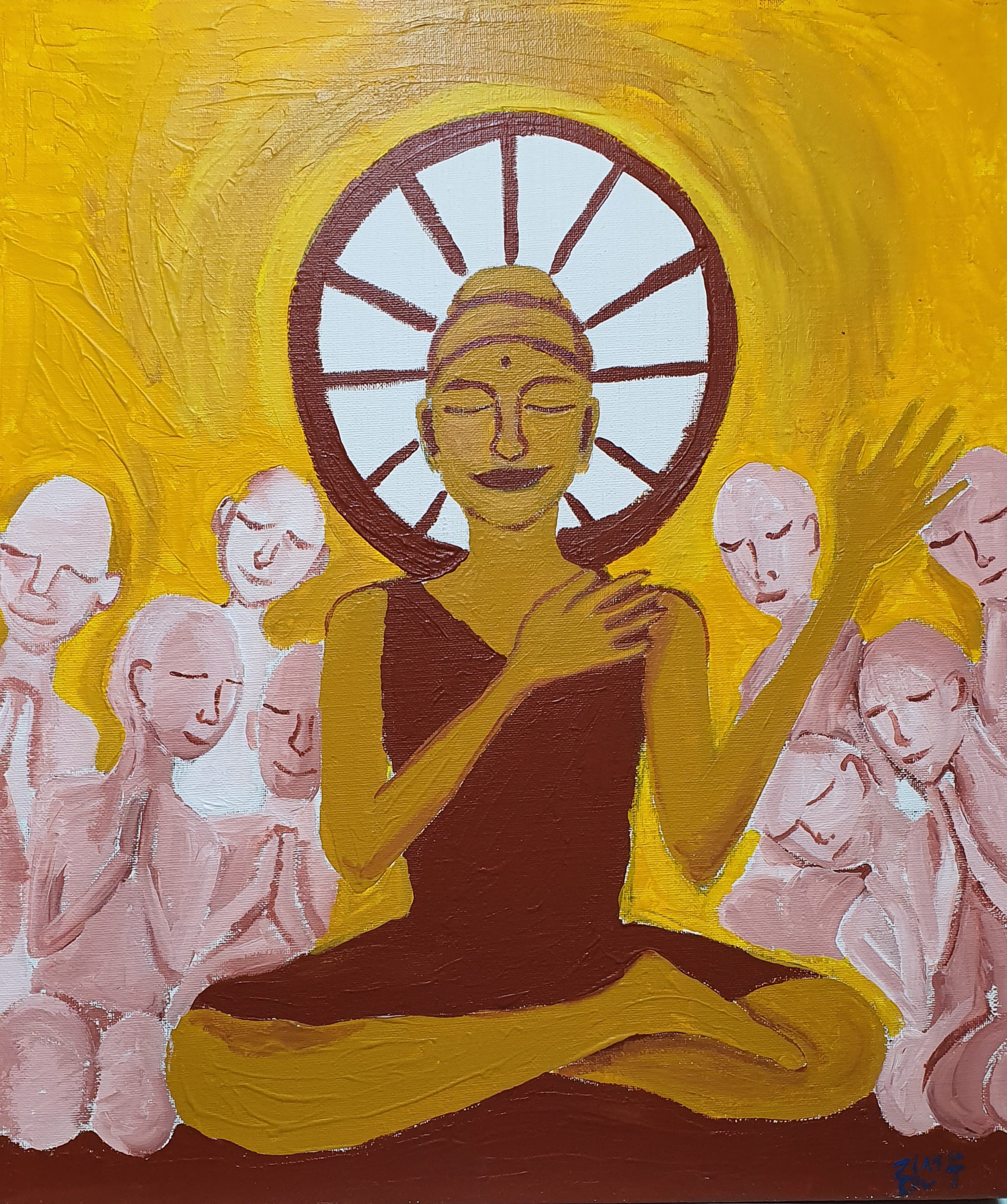 ‘초전법륜의 붓다’는 붓다의 머리 쪽 후광에 전법을 상징하는 수레바퀴가 자리하고 있어서 초전법륜(初轉法輪)의 첫 설법을 떠오르게 한다. 따라서 붓다가 깨달음을 성취하고 주변에 모인 사람들에게 처음 가르침을 전하는 장면으로 보인다. 그 가르침의 주요한 요지는 사성제, 팔정도 등등이었다. 초전법륜 불상은 그래서 유명하다. 김선우 작품에서는 인간들과 신들이 함께 붓다의 처음 설법에 귀 기울여 듣고 있다. 그리고 기뻐하고 있다. 붓다 주변의 인물들은 모두 붓다에게 집중하고 있으며 경청한다. 김선우 작가는 붓다가 처음으로 법의 수레바퀴를 굴리고 있는 역사적인 순간을 자연스럽게 담았다.