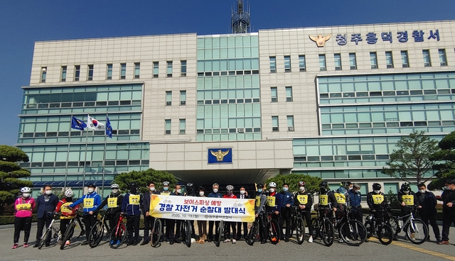 [동양일보 이도근 기자]가을이 한껏 무르익은 지난 10월 청주흥덕경찰서 정문 앞에 헬멧부터 신발까지 ‘풀착장’을 한 자전거 행렬이 등장했다. 흥덕경찰서 자전거순찰대 회원들이다.
