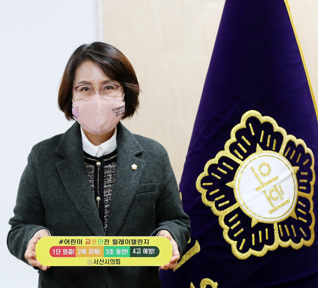[동양일보 장인철 기자]사진기사=이연희 의장이 4가지 교통안전수칙이 적힌 팻말을 들고 ‘어린이 교통안전 릴레이 챌린지’에 동참하고 있다.