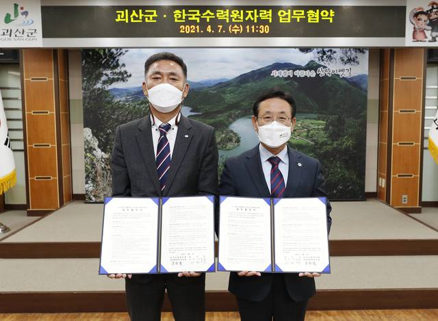 괴산군청 회의실에서 열린 이날 협약식에는 이차영 괴산군수, 정헌철 한국수력원자력 한강수력본부장을 비롯한 양 기관 관계자 10여명이 참석했다.