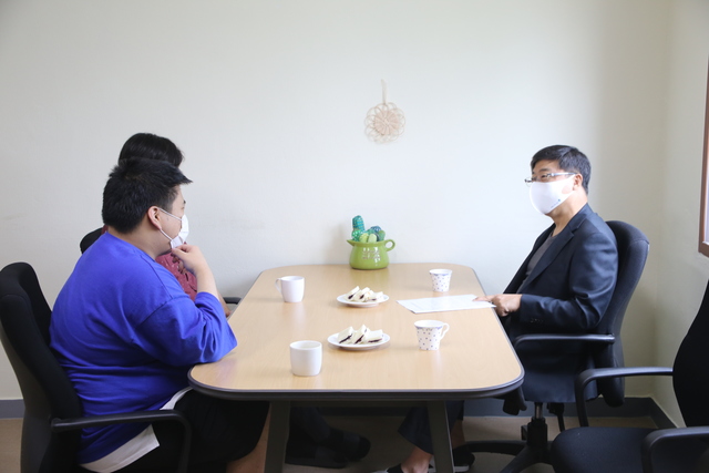 [동양일보 이도근 기자]이창영(오른쪽) 충북병무청장은 8일 괴산지역아동센터를 찾아 센터장과 환담하고, 사회복무요원 간담회와 복무교육을 했다. 또 이민수 사회복무요원 등 우수복무자에게 격려품을 수여하고 격려했다.