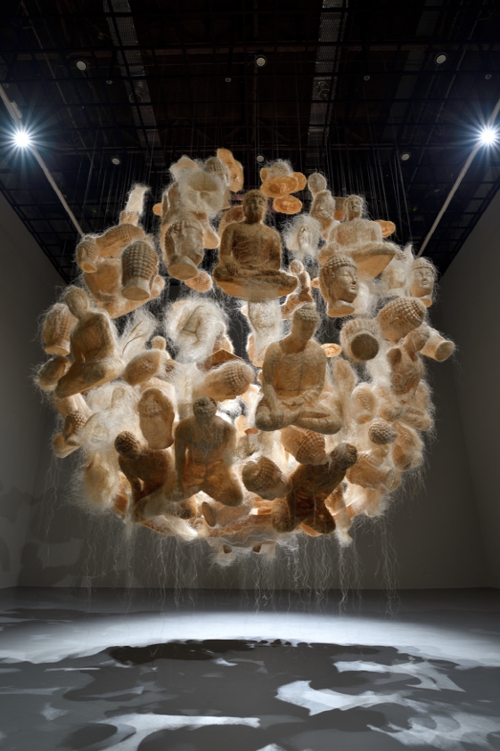 특히 이번 전시는 그의 작업의 집대성을 보여준다. 마로 제작한 108개의 불상과 불두를 높이 10.9m의 거대한 화이트큐브에 매달아 놓아 얽혀진 마 사이로 스미는 빛과 그림자로 공간을 가득 채웠다.