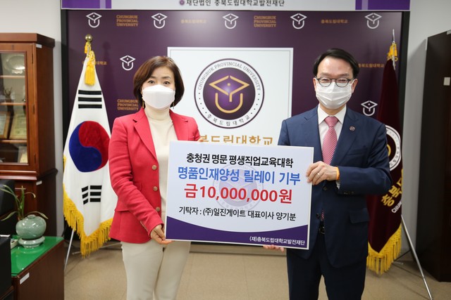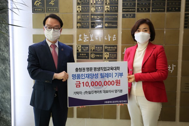 [동양일보 엄재천 기자]양기분(한국여성경제인협회 충북지회장) ㈜일진게이트 대표가 충북도립대학교 명품인재양성 릴레이 기부에 참여했다.