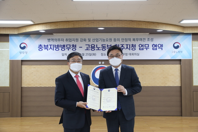 충북병무청은 25일 고용노동부 청주지청과 업무협약을 체결했다. 이 협약으로 양 기관은 맞춤형 고용 서비스를 통해 충북지역 청년층 고용증대, 전문연구요원 및 산업기능 요원 안정적 복무여건 조성에 노력한다.