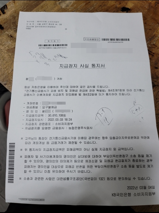 앞서 지난 3월 3일 황모씨 명의의 통장이 보이스피싱 범죄에 연루돼 지급정지 당하기도 했다.